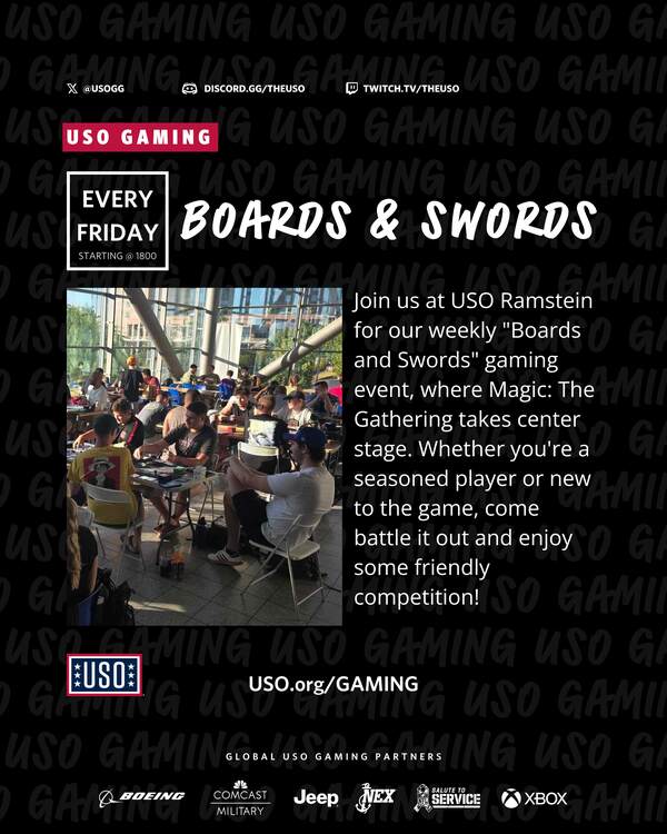 Join us at USO Ramstein for our weekly “Boards and Swords” gaming event, where Magic: The Gathering takes center stage. Whether you’re a seasoned player or new to the game, come battle it out and enjoy some friendly competition