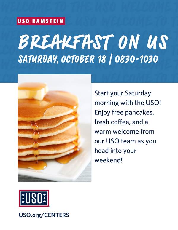 Start your weekend with a warm breakfast on us! Join the USO Ramstein team for our Breakfast on Us event, featuring fresh pancakes and hot coffee served right here at the center. This event is our way of giving back to the Ramstein community and helping you kick off your Saturday with good food and friendly faces. Stop by, grab a plate, and enjoy a relaxing morning with your USO family.