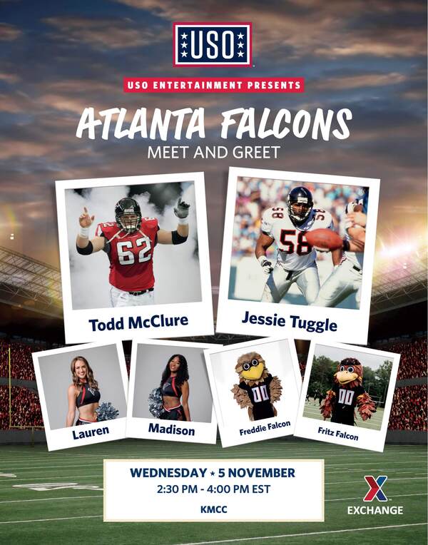 Exciting news! The Atlanta Falcons are touching down at the Ramstein KMCC food court. Hosted by the USO, this exciting event is an opportunity for service members and their families to connect with former players from the team, cheerleaders, and Fritz and Freddie Falcon!