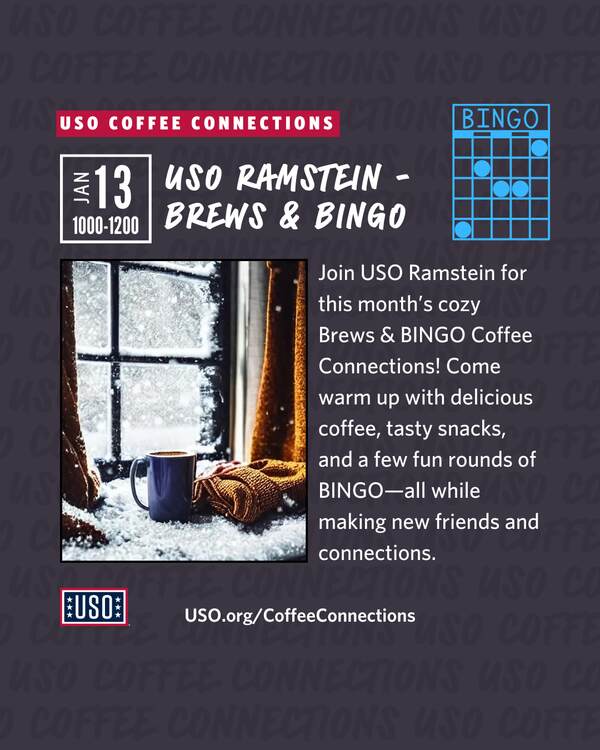 Join USO Ramstein for this month’s cozy Brews & BINGO Coffee Connections! Come warm up with delicious coffee, tasty snacks, and a few fun rounds of BINGO—all while making new friends and connections.