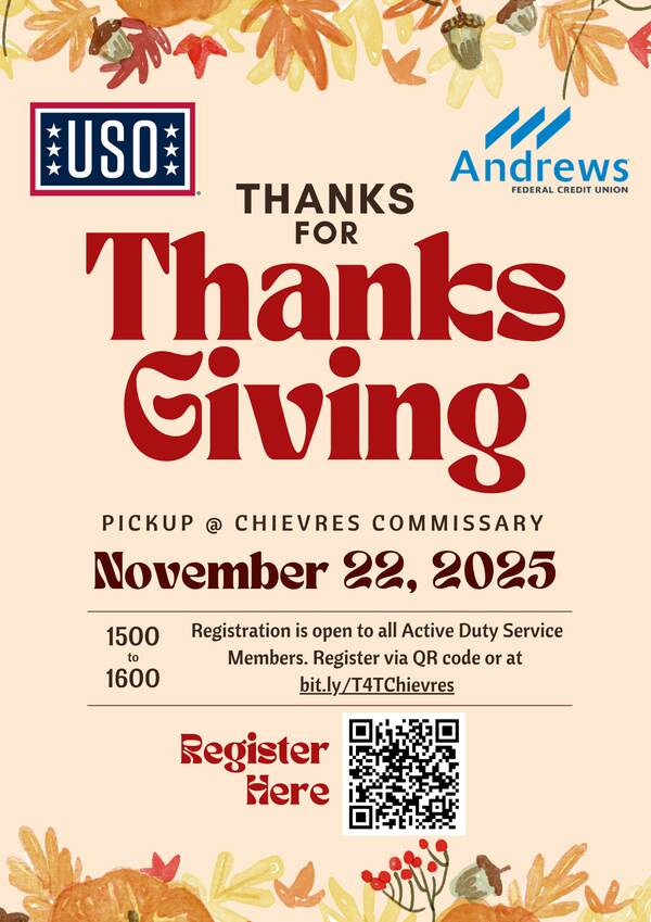 The USO, alongside Andrews Federal Credit Union, is giving away complimentary turkeys and pies to service members and their families.