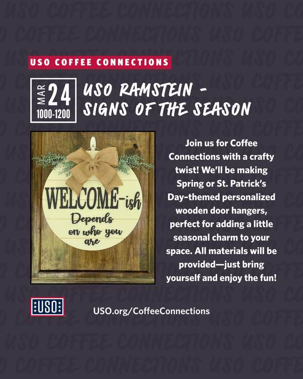 USO Canine Volunteers will be on-site to provide plenty of puppy love while we serve up fresh, delicious pancakes for the Ramstein community. Whether you’re working or just need a pick-me-up, stop by to enjoy some furry friends and flapjacks!