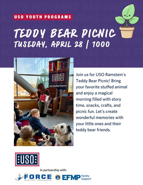 USO Canine Volunteers will be on-site to provide plenty of puppy love while we serve up fresh, delicious pancakes for the Ramstein community. Whether you’re working or just need a pick-me-up, stop by to enjoy some furry friends and flapjacks!
