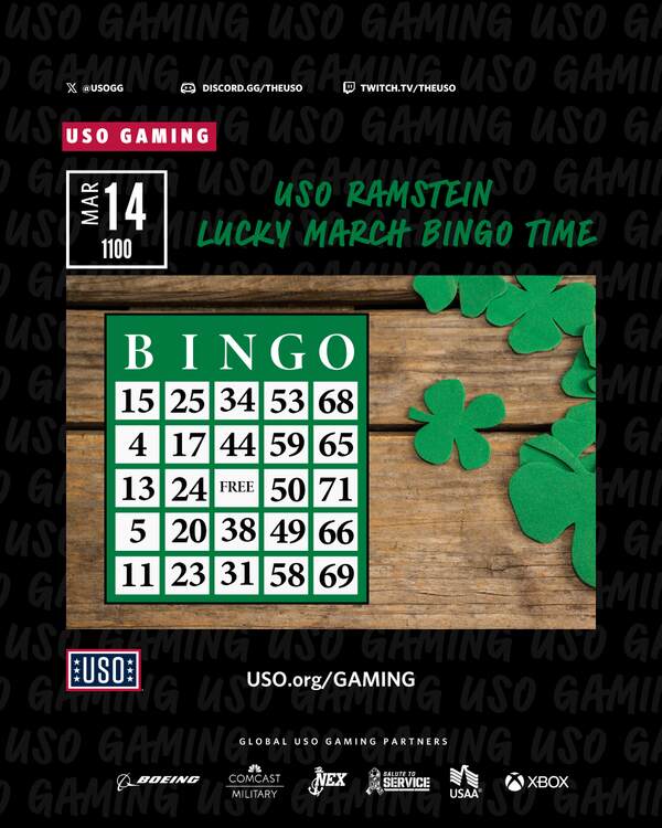 🍀 Lucky March BINGO Time! 🍀 Feeling lucky? You should be! Join USO Ramstein for our March Family BINGO event, Lucky March BINGO Time! This festive, fun-filled event is open to all families with base access.